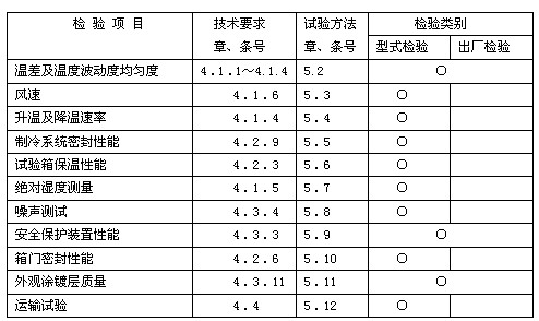 注:高低溫測(cè)試儀要求檢驗(yàn)的項(xiàng)目用“○”表示,無“○”者表示不要求檢驗(yàn)。