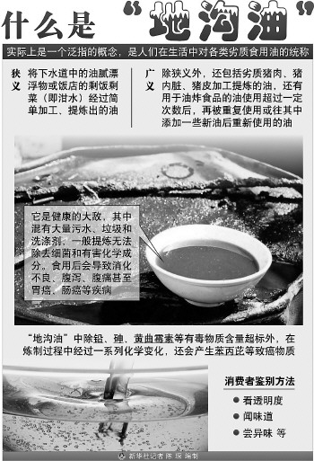 研究表明,長期攝入地溝油會對人體造成明顯傷害,如發育障礙、易患腸炎,并有肝、心和腎腫大以及脂肪肝等病變。而地溝油中的主要危害物之一黃曲霉素是一種強烈的致癌物質,其毒性是砒霜的100倍。另一個問題是倫理上的,別人吃過的油,在下水道里變質,再撈上來,你能吃得下去嗎? 那么,有沒有一種簡便的方法,可以鑒別地溝油呢?我們不妨聽聽食品科學專家和業內人士怎么說。 1、科學鑒別地溝油 目前沒有好辦法 在一個注重食品安全的時代,理想的狀態是,你下館子,隨手掏出一張試紙浸到菜里,過一會兒拿出來跟譜表比比,然后大叫:“掌柜的,換油!” 2、傳統的檢測方法 都有一定局限性 在科研工作者看來,治理地溝油的難點在于,經過洗滌、蒸餾、脫色、脫臭等精煉過程后,單從外觀和感官上,很難區分地溝油和普通油。不法商販還會把地溝油摻入食用油中,如果含量較少,更是難以檢測。 3、鑒別地溝油 冰箱顯身手? 曾在北京多家大酒樓擔任總廚、高管的特級廚師馮鵬說,一般情況下,地溝油和普通油無法區分,進貨時難免上當。他只能通過實踐來判斷:飯館炒菜之前一般要先過油,在這道“滑油”工序中,好油可反復使用七八次,而地溝油最多使用三次就會變黏,而且有哈喇味兒。 “另外,室外溫度較低時,地溝油會像棕櫚油一樣凝固,所以常有人用地溝油冒充棕櫚油。”馮鵬說,冬天可以據此鑒別地溝油,夏天則可通過冰箱來檢驗。一些媒體認為地溝油有味道,可以聞出來,此外里面含水多,下鍋會爆響,馮鵬認為這些都是無稽之談,因為水根本摻不進油中,且地溝油也沒什么異味。 4、我們該如何 鑒別地溝油? 一看?赐该鞫,純凈的植物油呈透明狀,在生產過程中由于混入了堿脂、蠟質、雜質等物,透明度會下降;看色澤,純凈的油為無色,在生產過程中由于油料中的色素溶于油中,油才會帶色;看沉淀物,其主要成分是雜質。 二聞。每種油都有各自獨特的氣味?梢栽谑终粕系我粌傻斡,雙手合攏摩擦,發熱時仔細聞其氣味。有異味的油,說明質量有問題,有臭味的很可能就是地溝油;若有礦物油的氣味更不能買。 三嘗。用筷子取一滴油,仔細品嘗其味道?诟袔嵛兜挠褪遣缓细癞a品,有焦苦味的油已發生酸敗,有異味的油可能是地溝油。 四聽。取油層底部的油一兩滴,涂在易燃的紙片上,點燃并聽其響聲。燃燒正常無響聲的是合格產品;燃燒不正常且發出“吱吱”聲音的,水分超標,是不合格產品;燃燒時發出“噼啪”爆炸聲,表明油的含水量嚴重超標,而且有可能是摻假產品,絕對不能購買。 五問。問商家的進貨渠道,必要時索要進貨發票或查看當地食品衛生監督部門抽樣檢測報告。 |