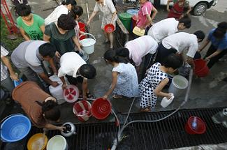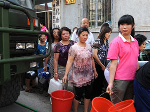 自7月31日被洪水沖斷自來水輸水管線至今,吉林省通化市全市停水已經超過48小時,市區33萬人面臨用水難題。消防部門和城建部門調運25臺送水車,循環給居民送水,通化市隨處可見提著水桶找水的市民.